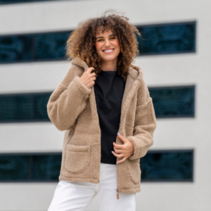 Pehme ja väga soe naiste kapuutsiga jakk. Kahe väikese taskuga, tõmblukuga ja ökonaha detailidega.
