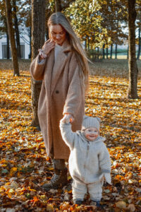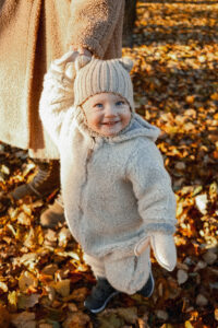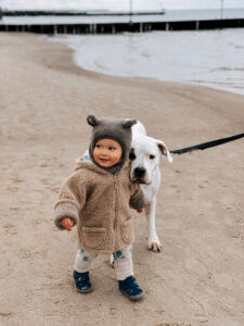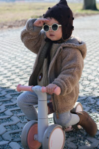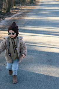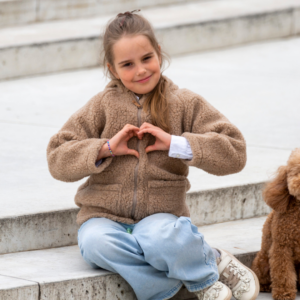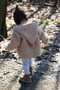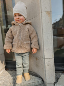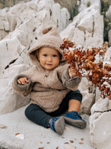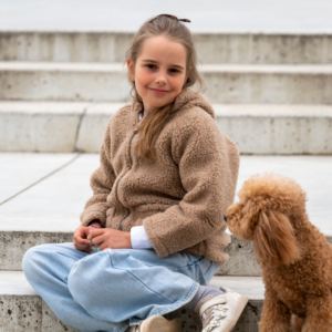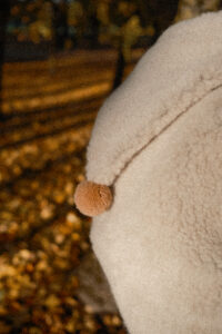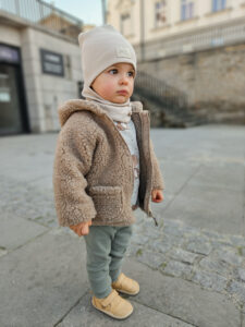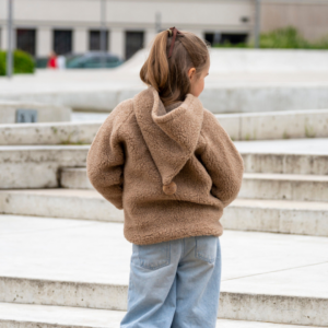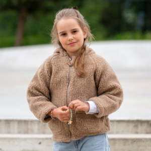 Pehme ja väga soe kapuutsiga lastejope. Sellel on kaks väikest taskut ja tõmblukuga kinnitus. Kapuuts on kaunistatud tuttidega. Stiilset välimust täiendavad ökonahast detailid.